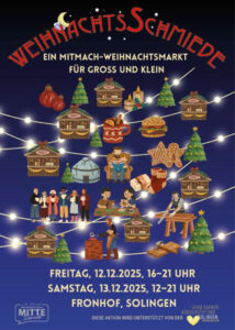 - Die WeihnachtsSchmiedeMit der „WeihnachtsSchmiede – Einem Mitmach-Weihnachtsmarkt für Groß und Klein“ – verbreitet der Heimatverein MitteSchmiede am 3. Adventswochenende weihnachtliche Stimmung auf dem Fronhof in Solingen-Mitte. Weitere Informationen zur Veranstaltung bei Klick auf den Titel oder das Bild.